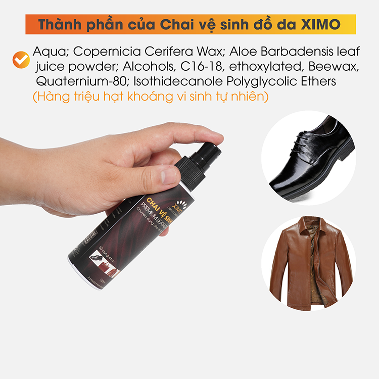 - Chai vệ sinh giày đồ da XIMO XI03 (150ml) giúp làm sạch vết bẩn, bụi bẩn, nấm mốc, vết ố vàng, khử nhiễm, đồng thời thẩm thấu, tái tạo lại sự đàn hồi dẻo dai của da, chăm sóc da khỏi bị khô nứt