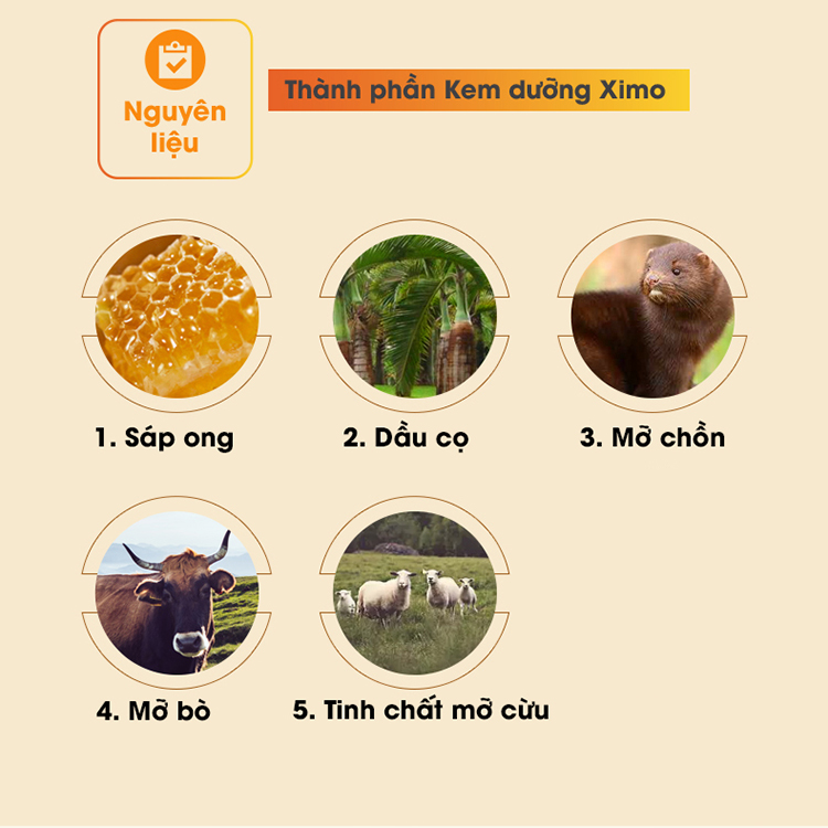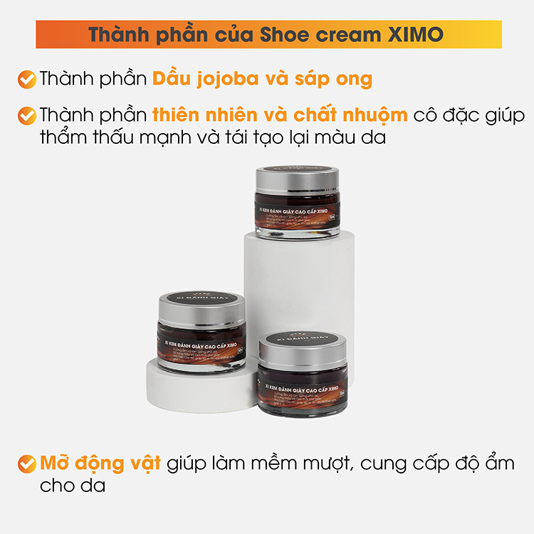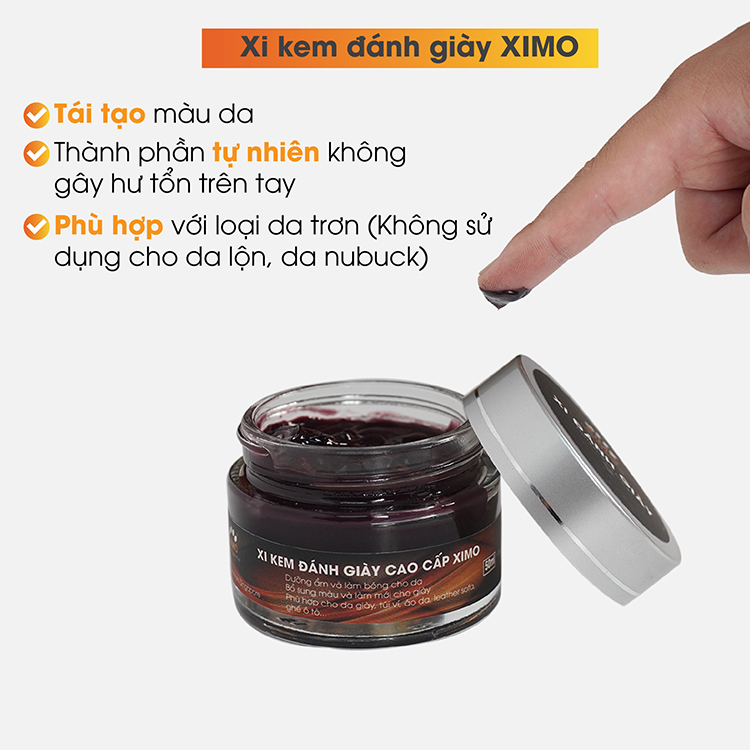 - Xi kem đánh giày XIMO XI02 (50ml) có thành phần sáp ong, dầu jojoba, mỡ động vật tinh khiết, thành phần thiên nhiên và chất nhuộm màu sẽ giúp thẩm thấu mạnh, tái tạo và phục hồi lại màu da. Giúp da có khả năng chống thấm nước, tránh bị hiện tượng nổ, bóng tróc, nứt da