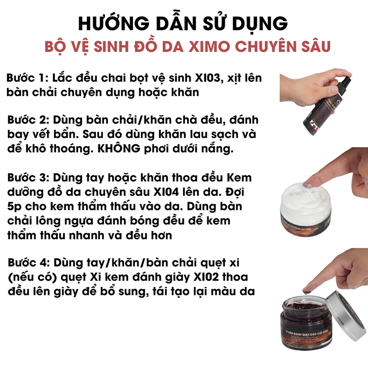 Hướng dẫn sử dụng Bộ vệ sinh đồ da XIMO làm sạch làm mới bảo vệ