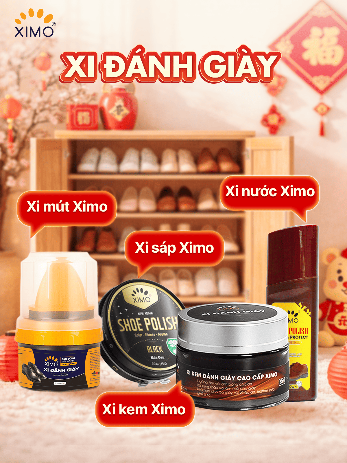 Đối với giày da, việc làm sạch thôi là chưa đủ. Xi đánh giày XIMO với đa dạng dòng sản phẩm như xi sáp, xi mút, xi kem, xi nước giúp làm mới màu da, tăng độ bóng tự nhiên, đồng thời hỗ trợ chống thấm và dưỡng da giày, hạn chế nứt gãy khi sử dụng lâu ngày.