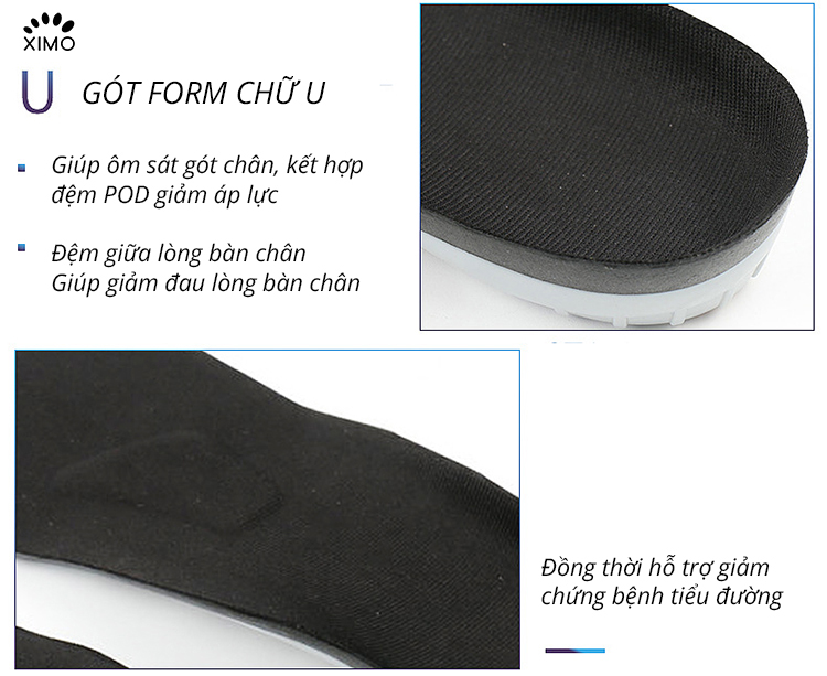 - Gót chữ U êm ái giúp giữ cố định gót chân khi di chuyển.