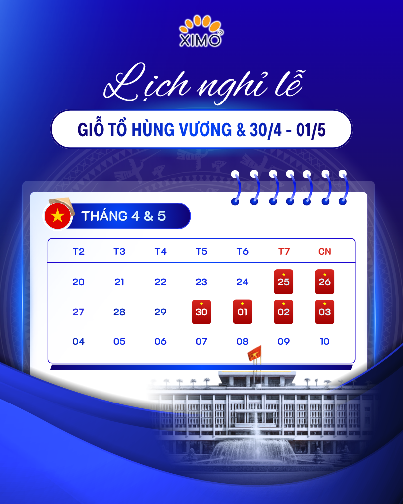 XIMO THÔNG BÁO LỊCH NGHỈ LỄ GIỖ TỔ HÙNG VƯƠNG & 30/04 - 01/05/2026
